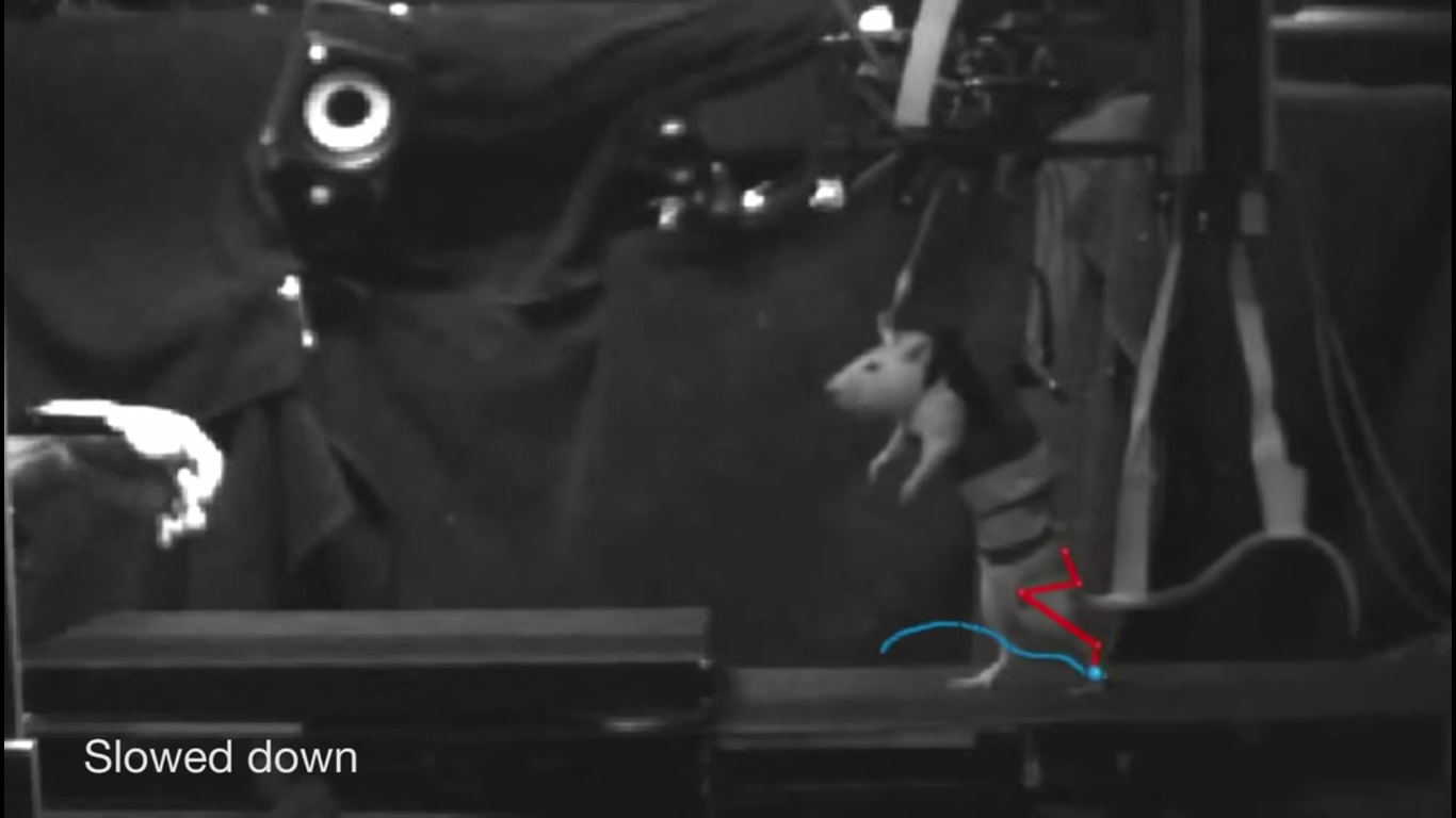 En el vídeo podemos observar una rata parapléjica caminando con fluidez mediante una cinta de correr e incluso logra subir escaleras. Erguida sobre sus patas traseras gracias a un arnés es capaz de desplazarse durante 25 minutos, sin ningún problema, pese a tener la médula espinal seccionada en dos partes.